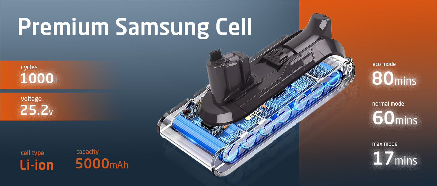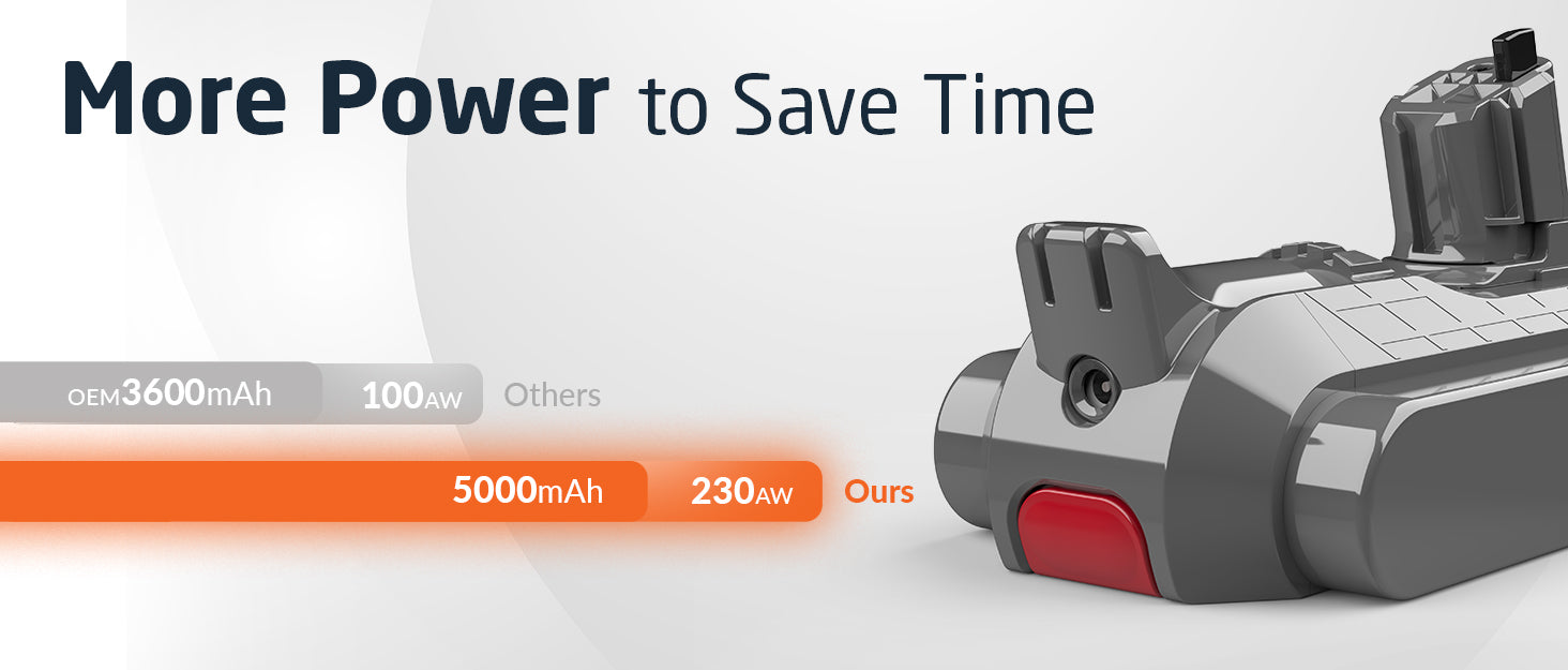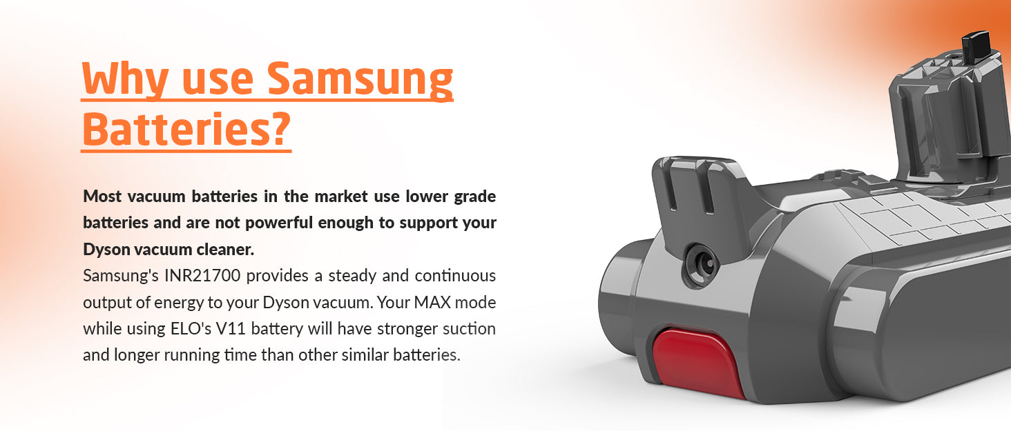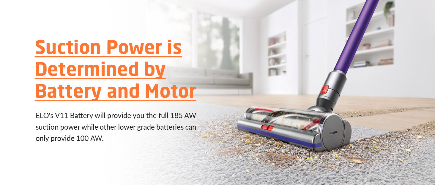 - Premium Battery (Samsung made Lithium-ion batteries) for Dyson V11 Outsize Battery; Full 185 AW suction power for 95 mins on ECO; 55 mins on MED; and 16 mins on Boost.