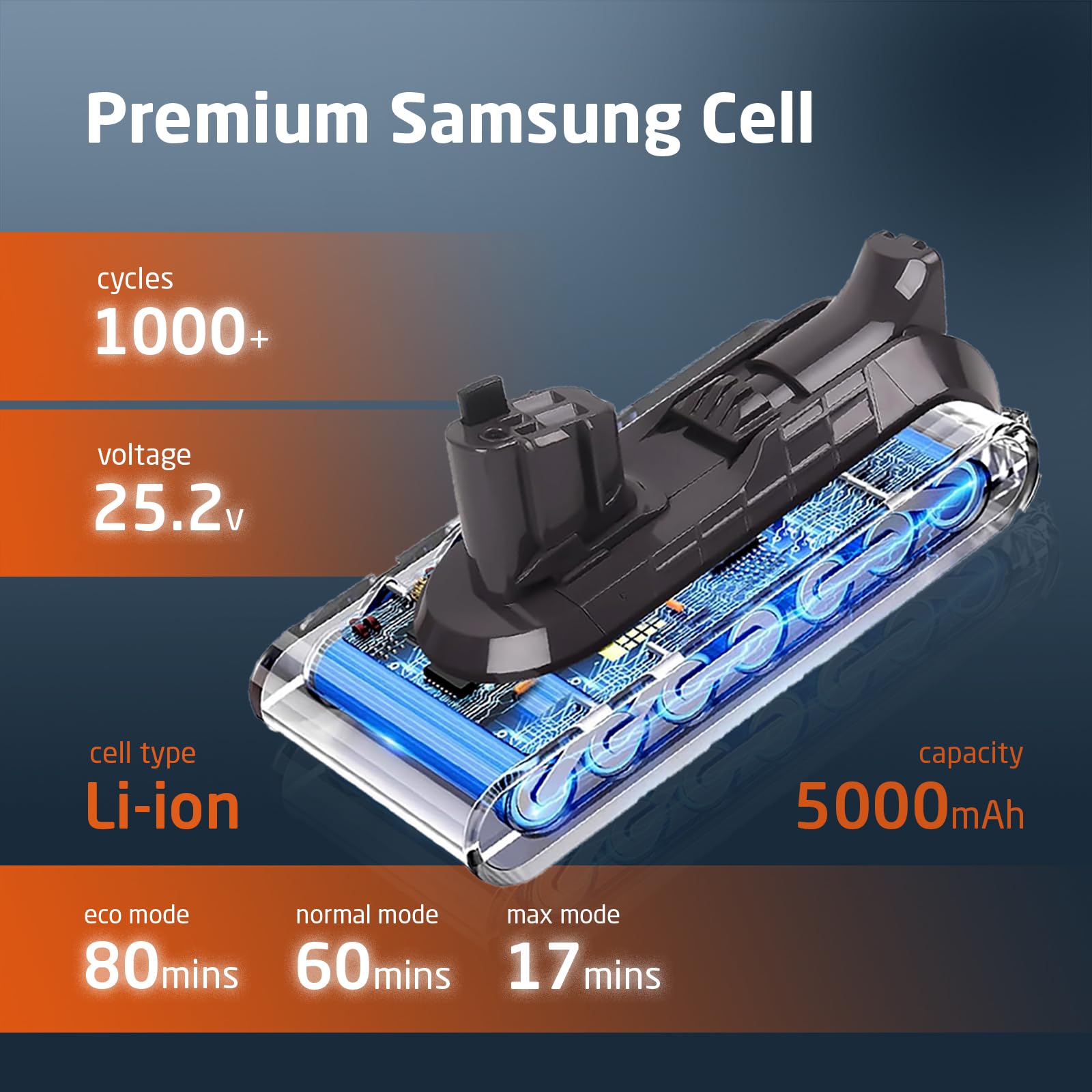• Premium Battery Performance: Samsung lithium-ion cells provide 240 AW suction power with up to 95 minutes on ECO mode, 55 minutes on MED, and 16 minutes on BOOST.