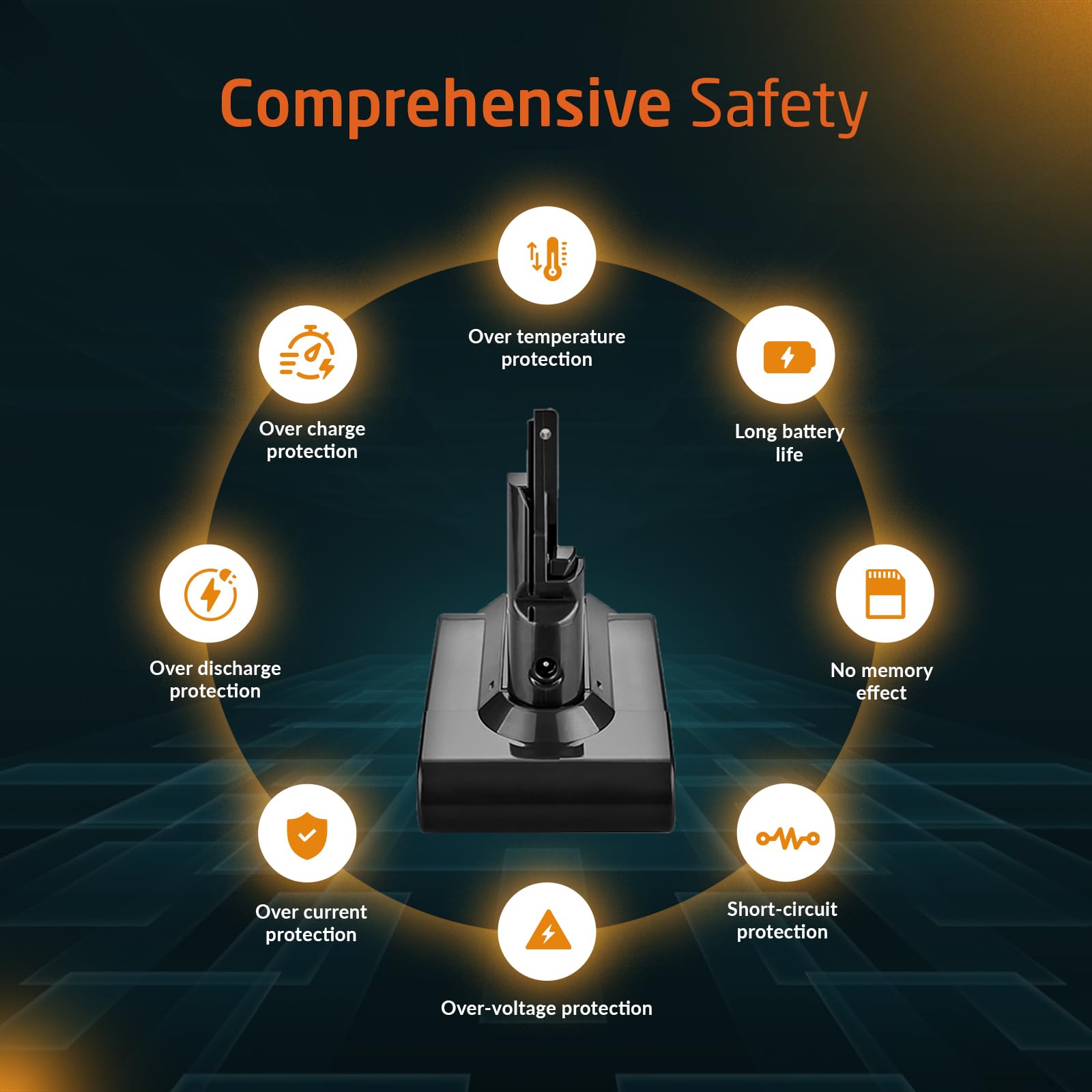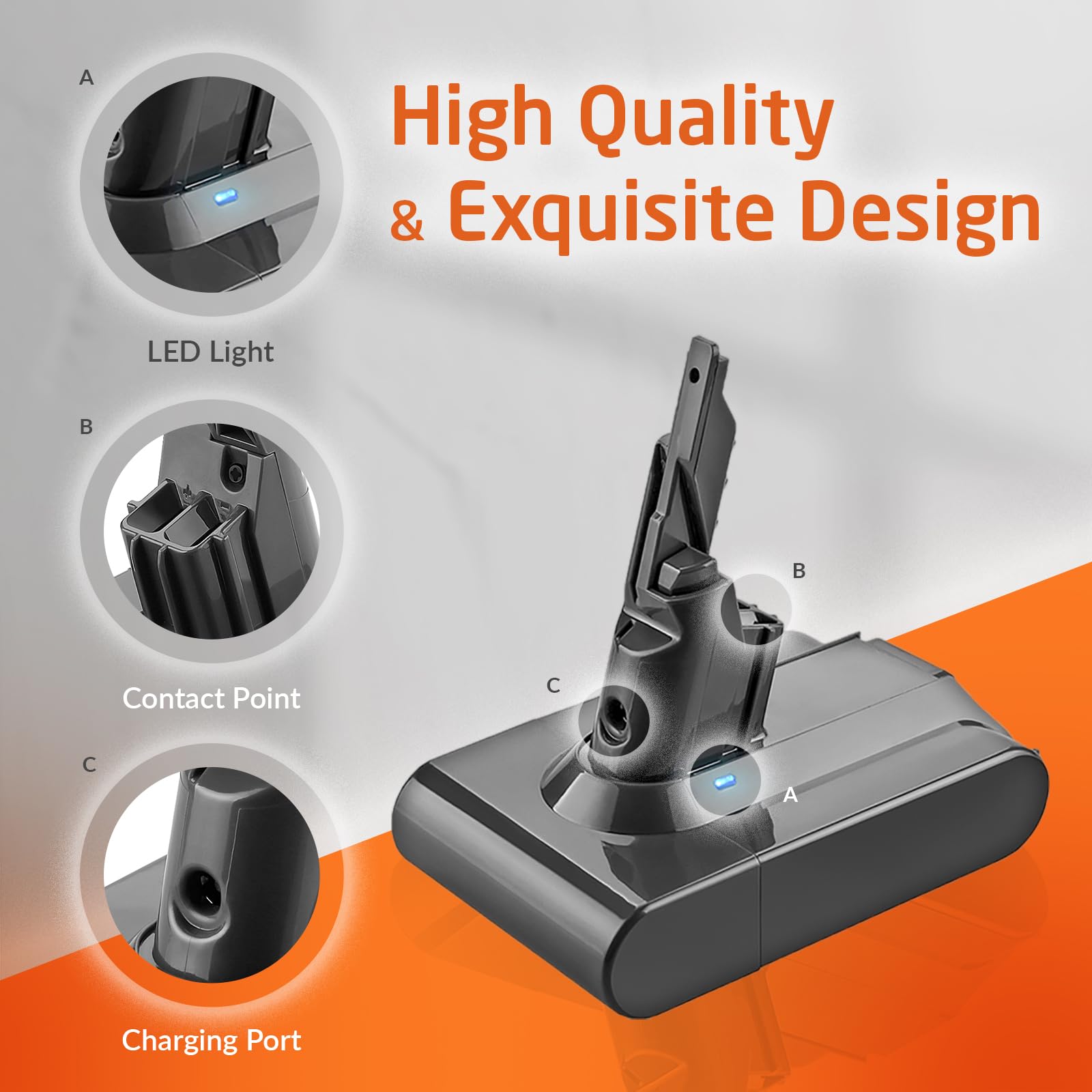 • ELO Proprietary Auto On/Off Function: Our innovative computer chip allows you to have one click turn On/Off control on your Dyson V6 Vacuum. Push the power button for 1 second to turn on, your machine will keep itself running. Push once again to turn off. Enjoy finger free vacuuming experience with our new V7 battery.